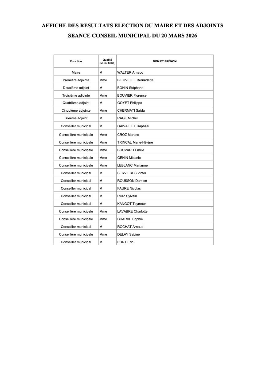 Suite au conseil municipal du 20 mars 2026, veuillez trouver ci-dessous les résultats de l'élection du maire et des adjoints: